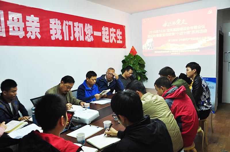 10月19日,為堅(jiān)持全面從嚴(yán)治黨,杜絕貪腐現(xiàn)象的滋生,湖北路橋鄖西PPP項(xiàng)目積極響應(yīng)集團(tuán)公司黨委的廉政號(hào)召,組織開(kāi)展了2018年10月黨風(fēng)廉政建設(shè)專題會(huì)議暨紀(jì)檢監(jiān)察宣傳教育“十進(jìn)十建”系列活動(dòng)。