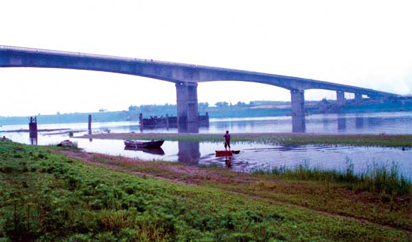 天門漢江大橋長1329米,主橋孔跨布置為(50 60) (85 116 116 85) (50 50)米三聯(lián)預(yù)應(yīng)力混凝土連續(xù)梁橋,橋?qū)?4.5米,主跨116米,樁基107根,樁徑2米,預(yù)應(yīng)力混凝土連續(xù)變截面箱梁結(jié)構(gòu),于1996年建成,被交通部授予“優(yōu)質(zhì)工程”。