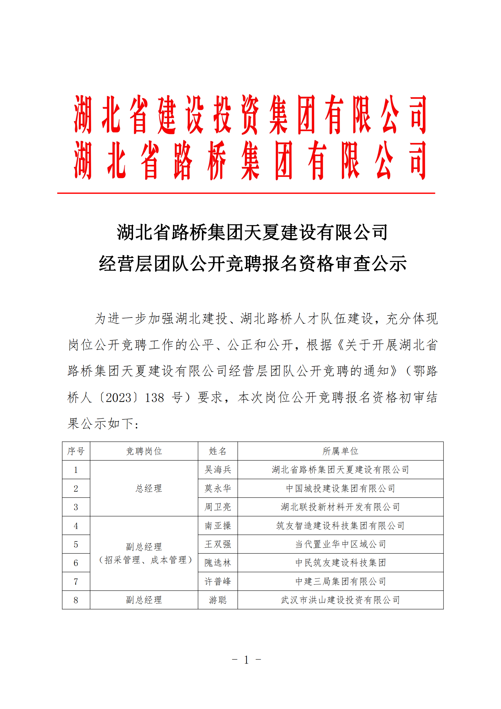 湖北省路橋集團(tuán)天夏建設(shè)有限公司經(jīng)營(yíng)層團(tuán)隊(duì)公開(kāi)競(jìng)聘報(bào)名資格審查公示
