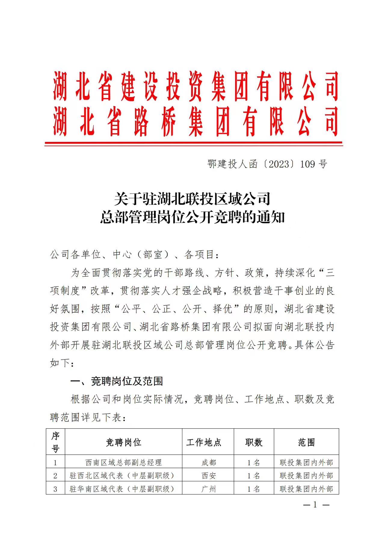 關(guān)于駐湖北聯(lián)投區(qū)域公司總部管理崗位公開競聘的通知