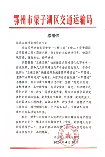 圖:梁子湖區(qū)交通運輸局感謝信????圖:梁子湖大隊表揚信