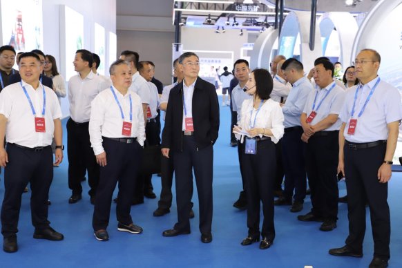 圖:中國交通運(yùn)輸協(xié)會(huì)副會(huì)長兼秘書長李剛(第一排左三)參觀湖北路橋展臺(tái)